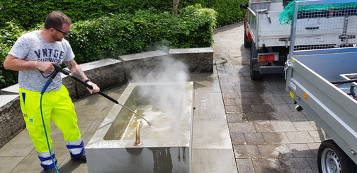 Der Werkdienst verfügt seit einigen Wochen über ein neues Gerät, welches mit hohem Druck und Dampf zur Vernichtung von Unkraut und zur Reinigung von steinernen Oberflächen und Brunnen dient.