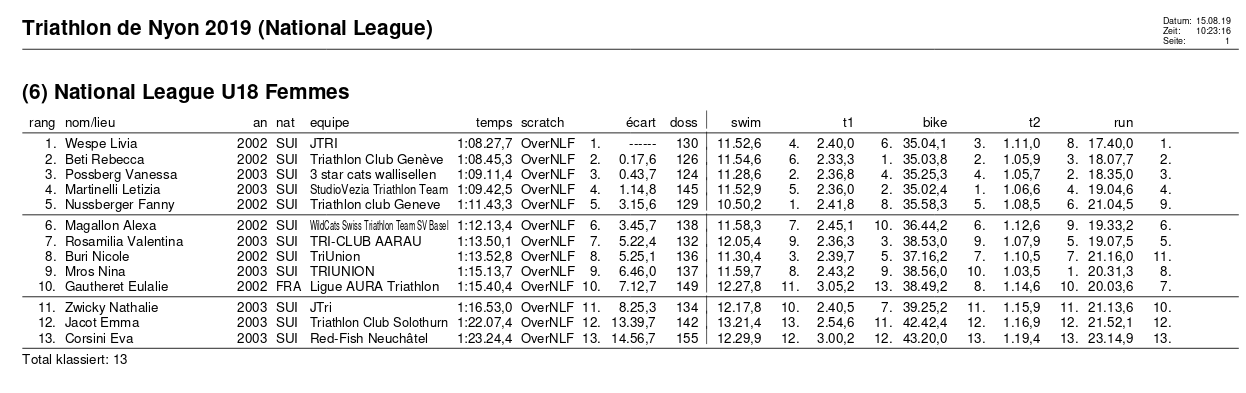 An der Triathlon Schweizermeisterschaft am 15.08.2019 in Nyon sicherte sich die Schmerknerin Livia Wespe die Goldmedaille in der U18 Kategorie. Sie distanzierte die zweitplatzierte Rebecca Beti um 17 Sekunden.