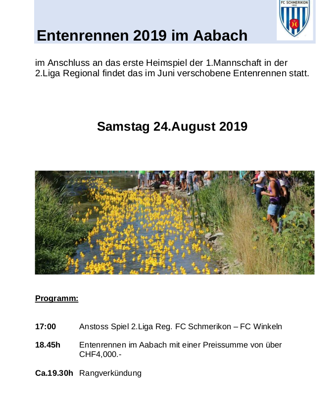Am Samstag 24.08.2019 findet der erste Match der Saison in der 2. Liga regional statt. Zusätzlich wird das Entenrennen nachgeholt. Dieses fiel am letzten Heimmatch der letzten Saison dem Regenwetter zum Opfer.