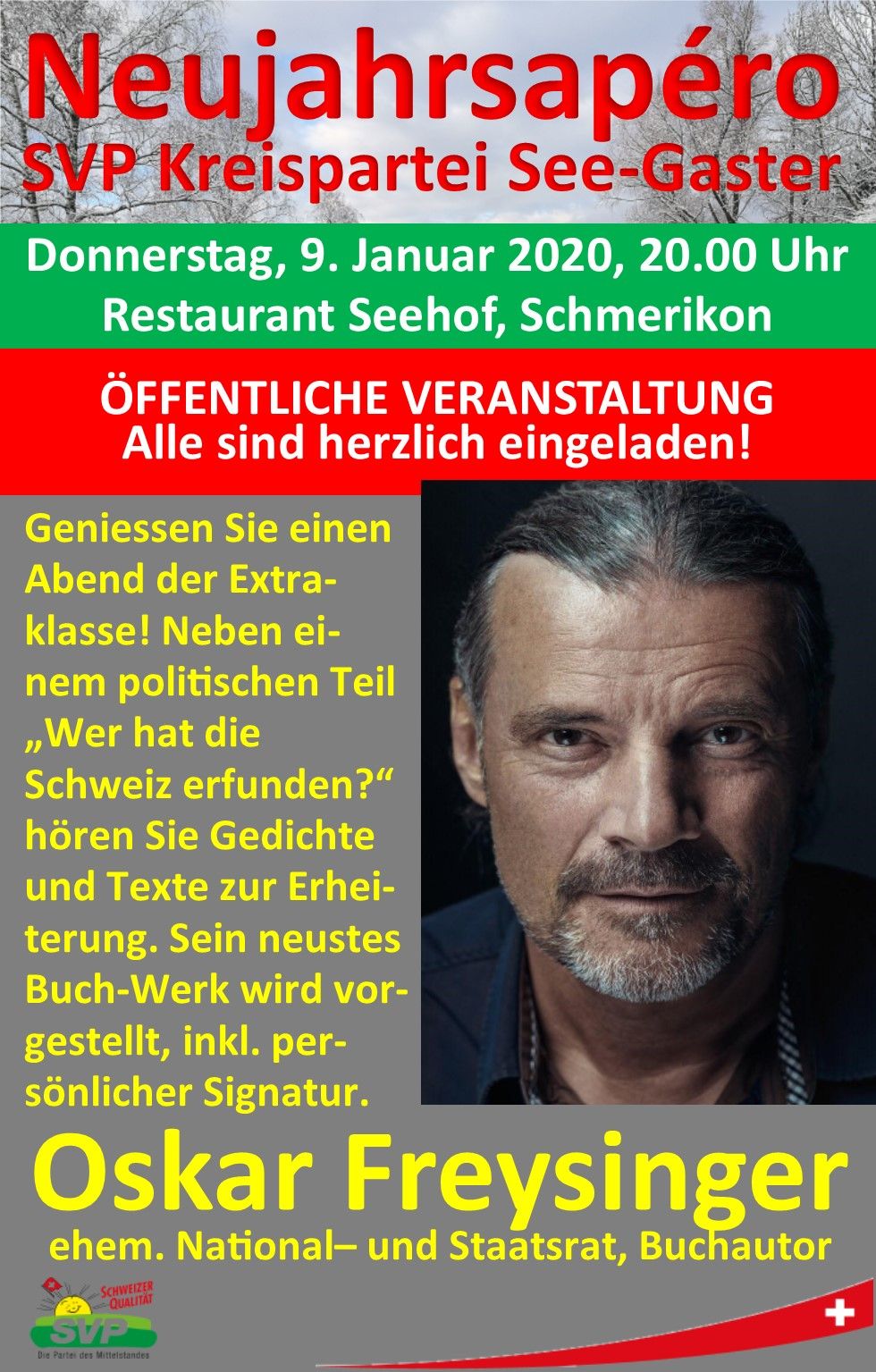Zum diesjährigen Neujahrsapéro ist es uns erneut gelungen, eine bekannte Persönlichkeit zu anzufragen. Wir freuen, dass Oskar Freysinger sofort zugesagt hat. Neben einem politischen Teil hören Sie Gedichte und Texte zur Erheiterung. Ebenso wird Oskar Freysinger sein neues Buch vorstellen, welches er selbstverständlich auch persönlich signiert.