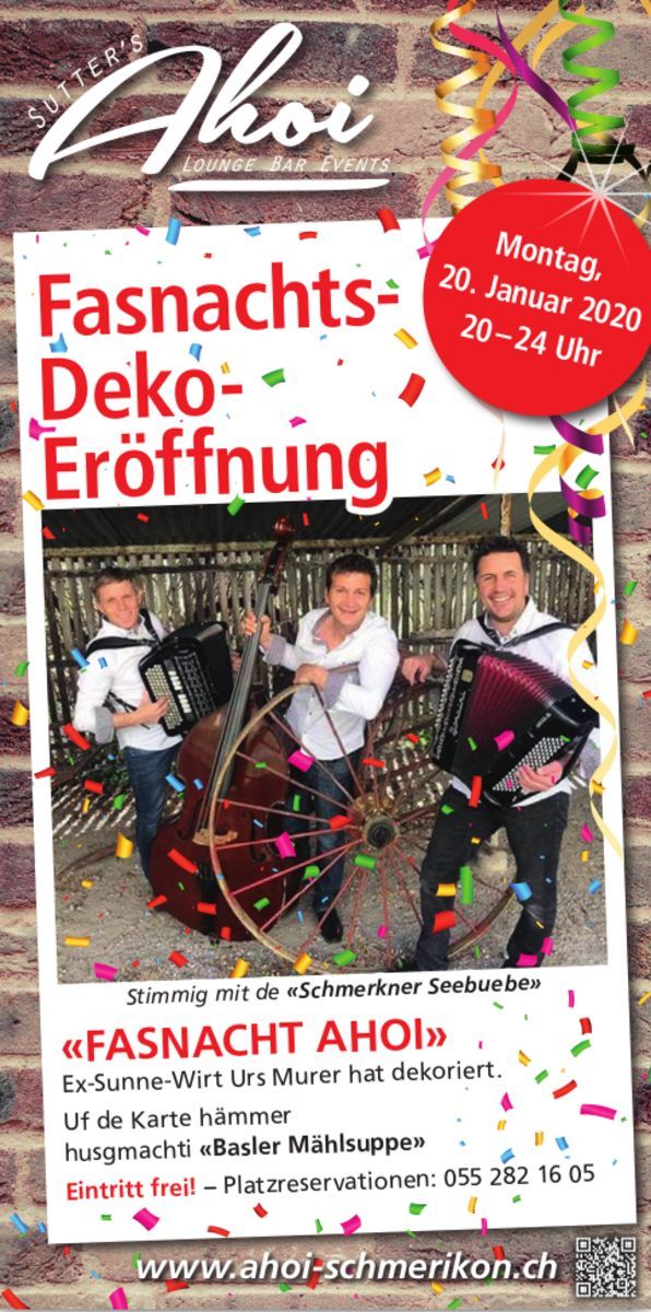 Am Montag 20. Januar 2020 spielen die Schmerkner Seebuebe im Ahoi. Es gilt die Fasnachts-Deko einzuweihen. Dieses Jahr hat Urs Murer, ehemaliger Gastgeber in der Sonne, die Deko-Arbeit übernommen.