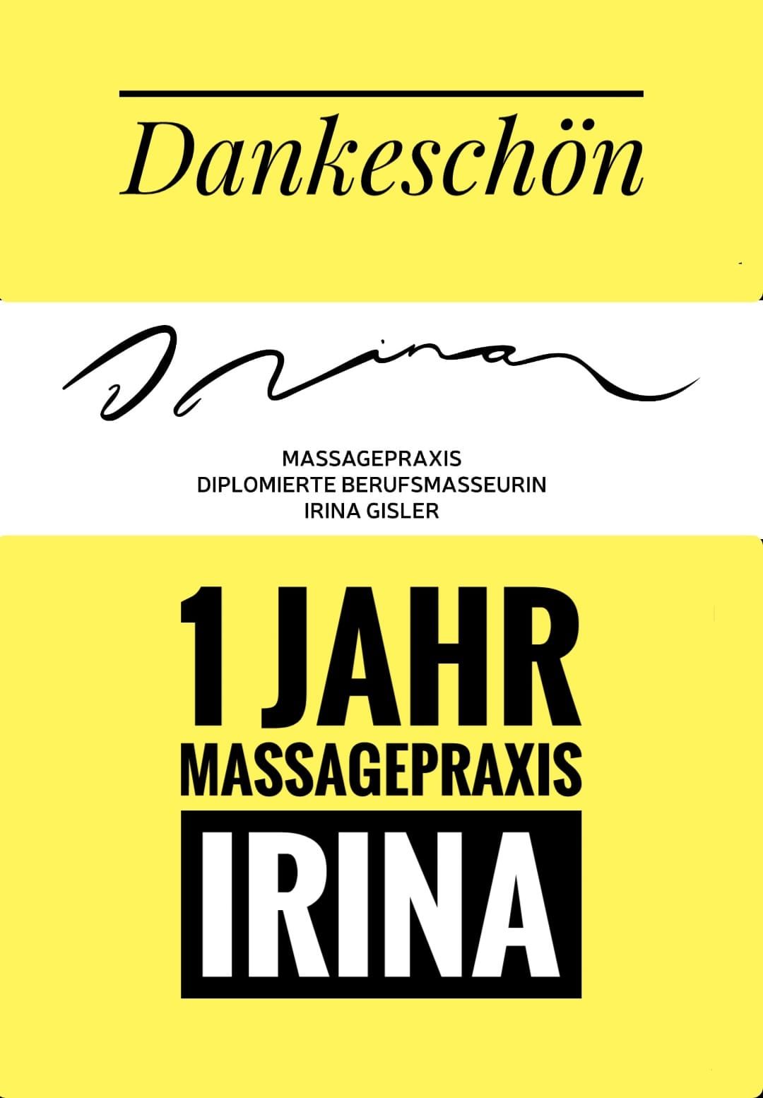 Überglücklich durfte ich, Irina Gisler, am 1. Mai das 1-jährige Bestehen feiern. Der Startschuss der Massagepraxis war in eine sehr aussergewöhnlichen und unvorhersehbaren Zeit. Nichtsdestotrotz wagte ich den mutigen Schritt mich am 1. Mai 2020 mit einer Massagepraxis selbstständig zu machen.