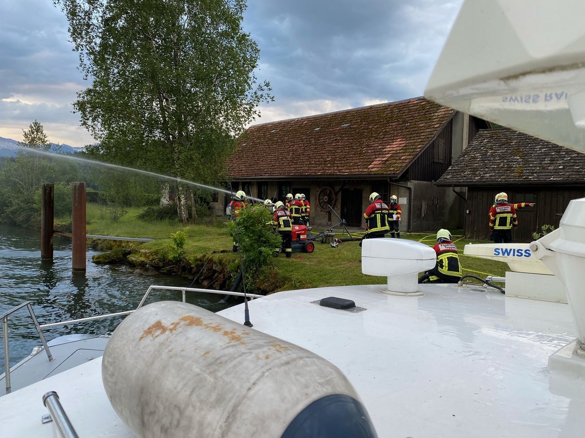 Titelbild: Die Feuerwehr Tuggen bei der Brandbekämpfung, im Hintergrund links das Hydroschild