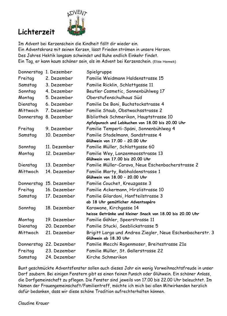Die Fenster sind jeweils von 17.00 bis 22.00 Uhr beleuchtet. Im Namen der Frauengemeinschaft/Familientreff, möchte ich mich bei allen Mitwirkenden herzlich dafür bedanken, dass wir diese schöne Tradition aufrechterhalten können.