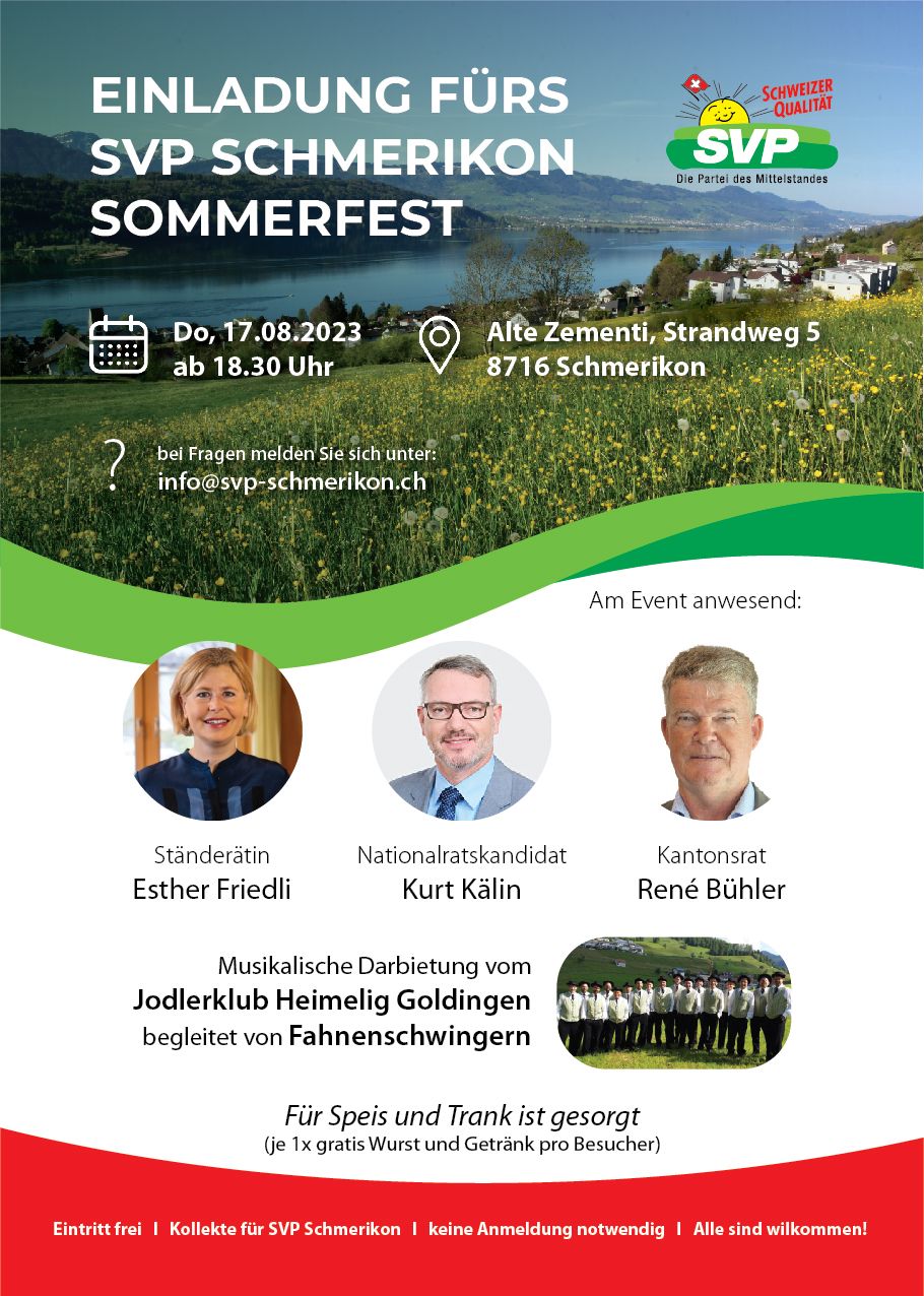 Die SVP Schmerikon lädt Sie herzlich dazu ein, an unserem diesjährigen Sommerfest teilzunehmen. Dieses findet am Donnerstagabend, dem 17.08.2023, ab 18.30 Uhr in der idyllischen Alten Zementi statt.