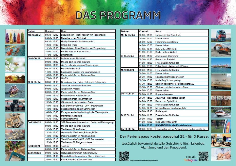 In den letzten Tagen wurden unsere Ferienspass-Flyer mit den neuen Kursen für diese Herbstferien in der Schule verteilt. Die Kinder können bis am 25. August auf der Webseite schmerikon.feriennet.projuventute.ch die vielseitigen Angebote entdecken und sich ihre Lieblingsaktivitäten in einer Wunschliste zusammenstellen.