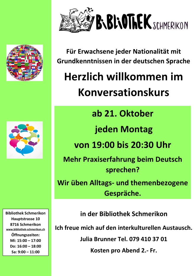 Ab dem 21. Oktober treffen sich Erwachsene jeder Nationalität mit Grundkenntnissen in der deutschen Sprache jeweils montags von 19 – 20.30 Uhr in der Bibliothek in Schmerikon. Es werden Alltagsgespräche geübt und auch themenbezogen miteinander gesprochen. Nur keine Hemmungen – hier gilt das Sprichwort für einmal umgekehrt: Schweigen ist Silber – Reden ist Gold.