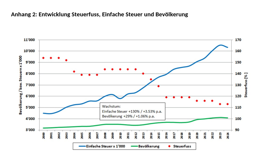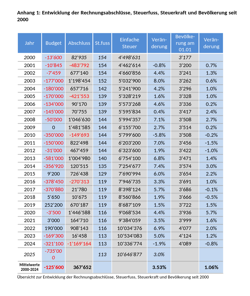 Die Jahresrechnung 2024 schliesst mit einem Aufwandüberschuss von 1.17 Mio. Franken oder CHF 800'000 schlechter als budgetiert ab. Die Gründe liegen auf der Einnahmenseite, betrug doch die Abweichung des bereits publizierten Steuerabschlusses 1.3 Mio. Franken unter Budget. Für 2025 erwartet der Gemeinderat erneut ein Defizit von CHF 735'000. Durch Bezug aus einem Ausgleichsfond wird eine Steuerfusserhöhung vermieden. Die Finanzplanung lässt jedoch keine Entspannung erwarten. Das ungebremste und durch die Gemeinde kaum beeinflussbare Ausgabenwachstum sowie Eigenheiten der Rechnungslegung werden aller Voraussicht nach in Kürze zu einem Anstieg des Steuerfusses führen. Der Finanzausgleich setzt die Gemeinde einem Steuerwettbewerb aus, in dem es kaum bestehen kann.