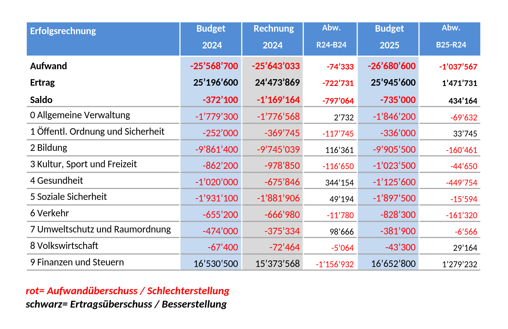 Die Erfolgsrechnung 2025 wird daher budgetiert mit einem Aufwandüberschuss von CHF 735’000 und weist damit eine Bessererstellung gegenüber dem Rechnungsjahr 2024 von CHF 434’164 auf. Diesem Ergebnis liegt ein gleichbleibender Steuerfuss von 113 % sowie eine Entnahme von CHF 500'000 aus der Ausgleichsreserve zu Grunde.