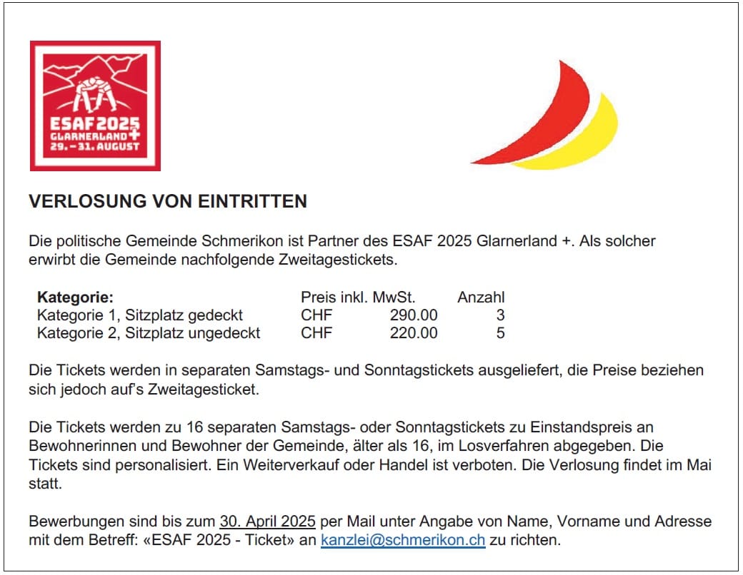 Die politische Gemeinde Schmerikon ist Partner des ESAF 2025 Glarnerland +. Als solcher erwirbt die Gemeinde insgesamt 8 Plätze Zweitagestickets. Diese werden zu 16 separaten Samstags- oder Sonntagstickets zu Einstandspreis an Bewohnerinnen und Bewohner der Gemeinde, älter als 16, im Losverfahren abgegeben. Die Tickets sind personalisiert. Ein Weiterverkauf oder Handel ist verboten. Die Verlosung findet im Mai statt.