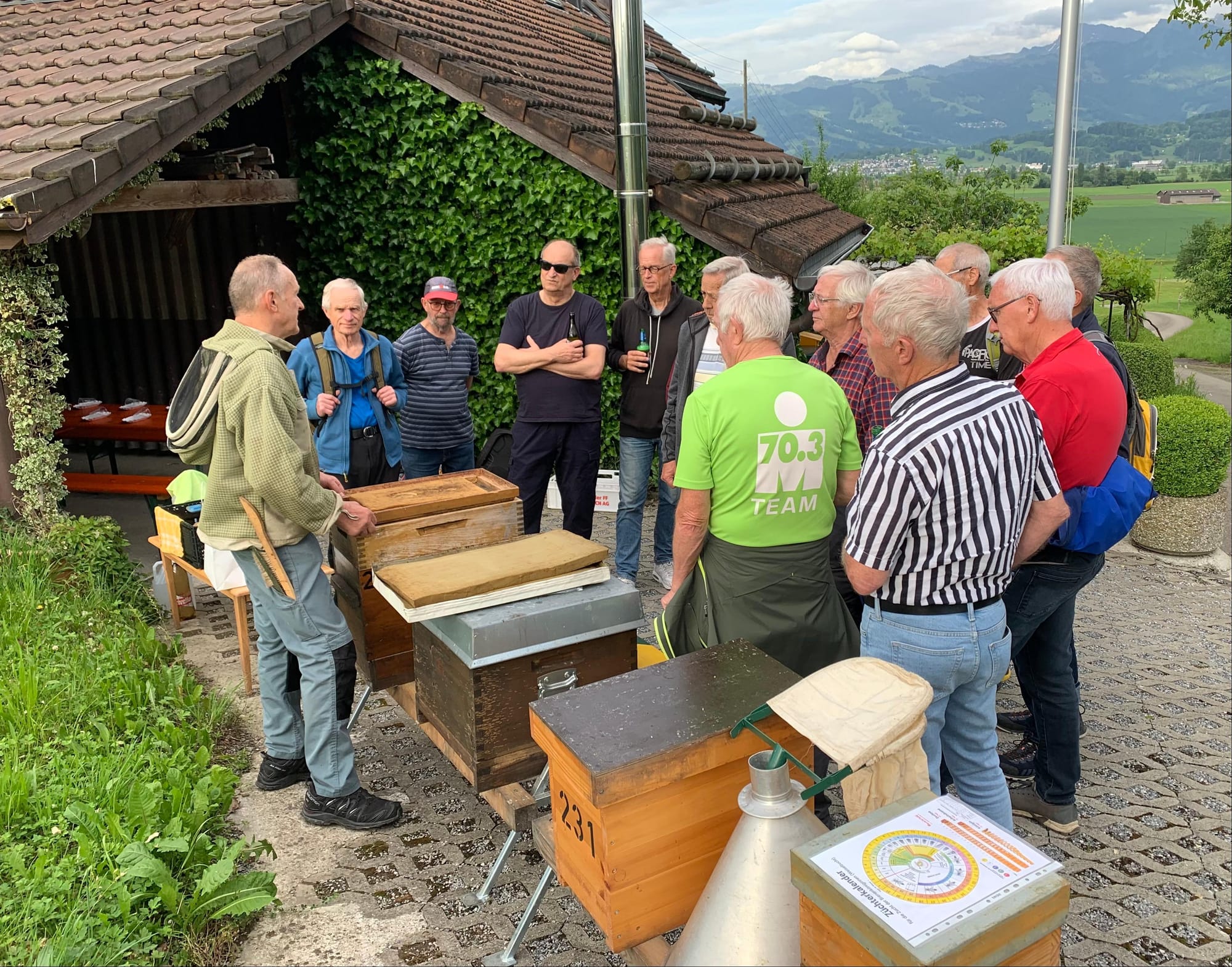Der Wanderweg führt vom Fussballplatz Tuggen zum Wangener Rank und bietet einem schönen Blick ins Gasterland. Am Ziel angekommen wurden wir verpflegt, mit Grillage und feinem Kuchengebäck sowie Durstlöscher. Anschliessend gab unser Turnkamerad Wisi Ott ein sachkundiger Vortrag über das Betriebssystem, der Beutenwahl in der Imkerei, bis zur Königinnenaufzucht der sehr interessant war.