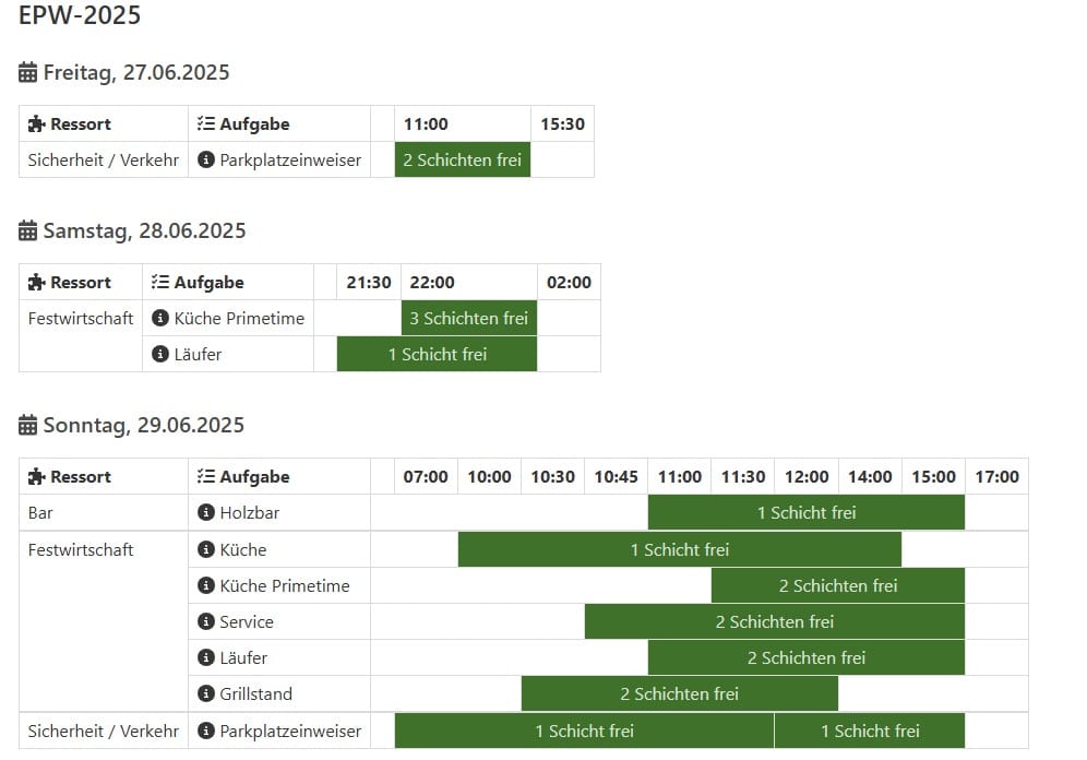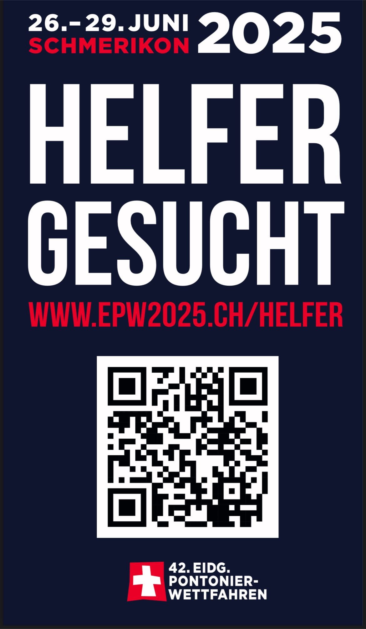 Liebe Schmerknerinnen und Schmerkner. Es sind die letzten Schichten zu besetzen. Hast du Lust und Zeit, uns an diesem einzigartigen Anlass in Form eines Helfereinsatzes zu unterstützen? Kennst du jemanden, der Interesse hat, an diesem traditionsreichen Spektakel dabei zu sein? Falls ja, melde dich ganz einfach mit wenigen Klicks aufwww.epw2025.ch/Helferan. Bist du bereits registriert und es wäre dir möglich eine zusätzliche Schicht zu übernehmen, würde uns dies natürlich auch sehr freuen. Sollte deine Wunsch-Schicht nicht mehr verfügbar sein, darfst du dich gerne unter helfer@epw2025.ch melden. Wir bemühen uns, eine individuelle Lösung zu finden. Die Pontoniere Schmerikon bedanken sich im Voraus ganz herzlich für Eure Mithilfe und freuen sich, bald möglichst viele Schmerkner/-innen in der Grynau anzutreffen.