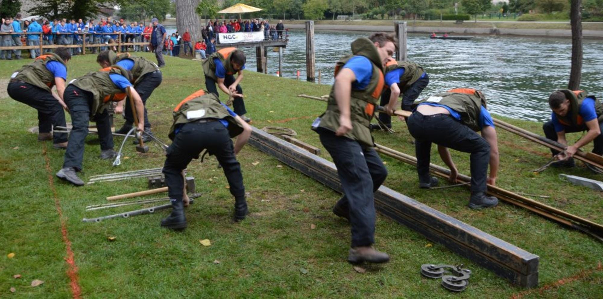 Eine weitere traditionelle Disziplin ist der Bootsfährenbau. Ein Drahtseil wird von einem 9-köpfigen Team am Boot befestigt, über den Fluss gezogen und durch raffinierte Weise zu einer stabilen Fähre verbunden. Eine Aufgabe mit militärischer Herkunft, die den Ursprung des Pontoniersports widerspiegelt. Dabei ist der Bootsfährenbau eine besonders nervenkitzelnde Disziplin, da meist nur wenige Sekunden über Sieg oder Niederlage entscheiden.
