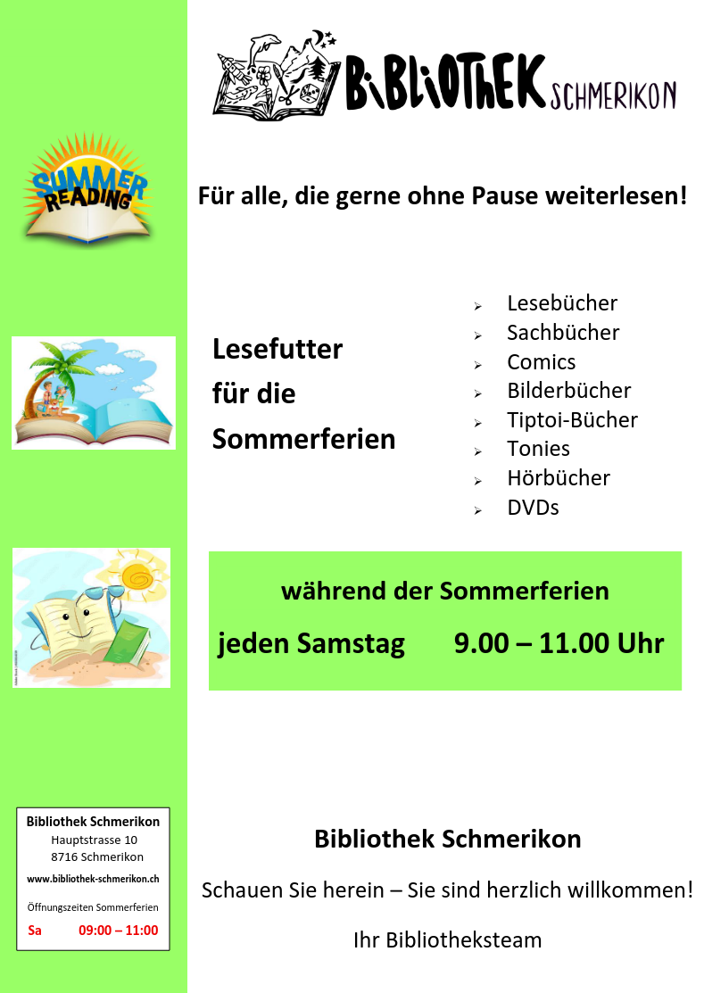 Sie möchten ohne (Sommer-)Pause weiterlesen? Kein Problem. Die Bibliothek hat während den Schulferien (5.Juli – 10.August) immer samstags von 9-11Uhr geöffnet.