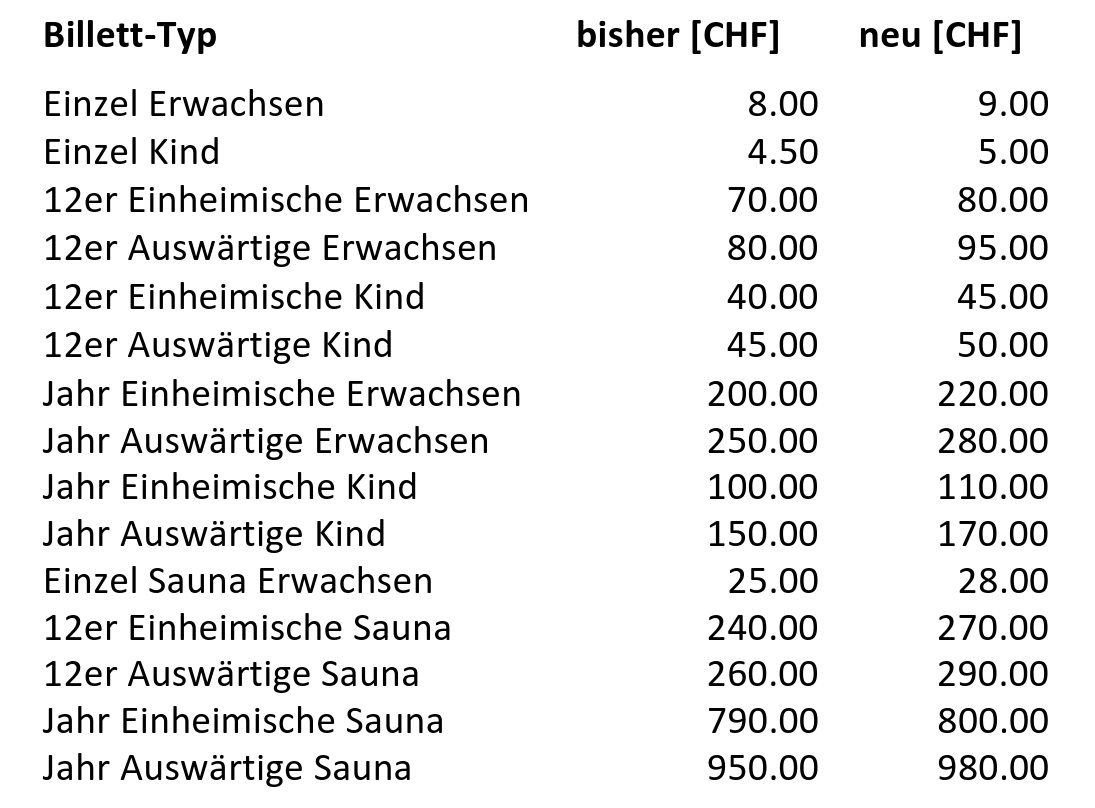Die Gemeinde passt die Eintrittspreise des Hallen- und Seebades an. Sie kompensiert die aufgelaufene Teuerung und bezweckt durch eine rund 6-Prozentige Realerhöhung die Reduktion des Defizits dieser beliebten Schul-, Sport- Freizeitanlage an. Nach wie vor sind die Preise attraktiv und weit davon entfernt kostendeckend zu sein. Der Gemeinderat strebt an, in dieser Legislaturperiode die weitere Entwicklung dieser in die Jahre gekommenen Anlage zu definieren.