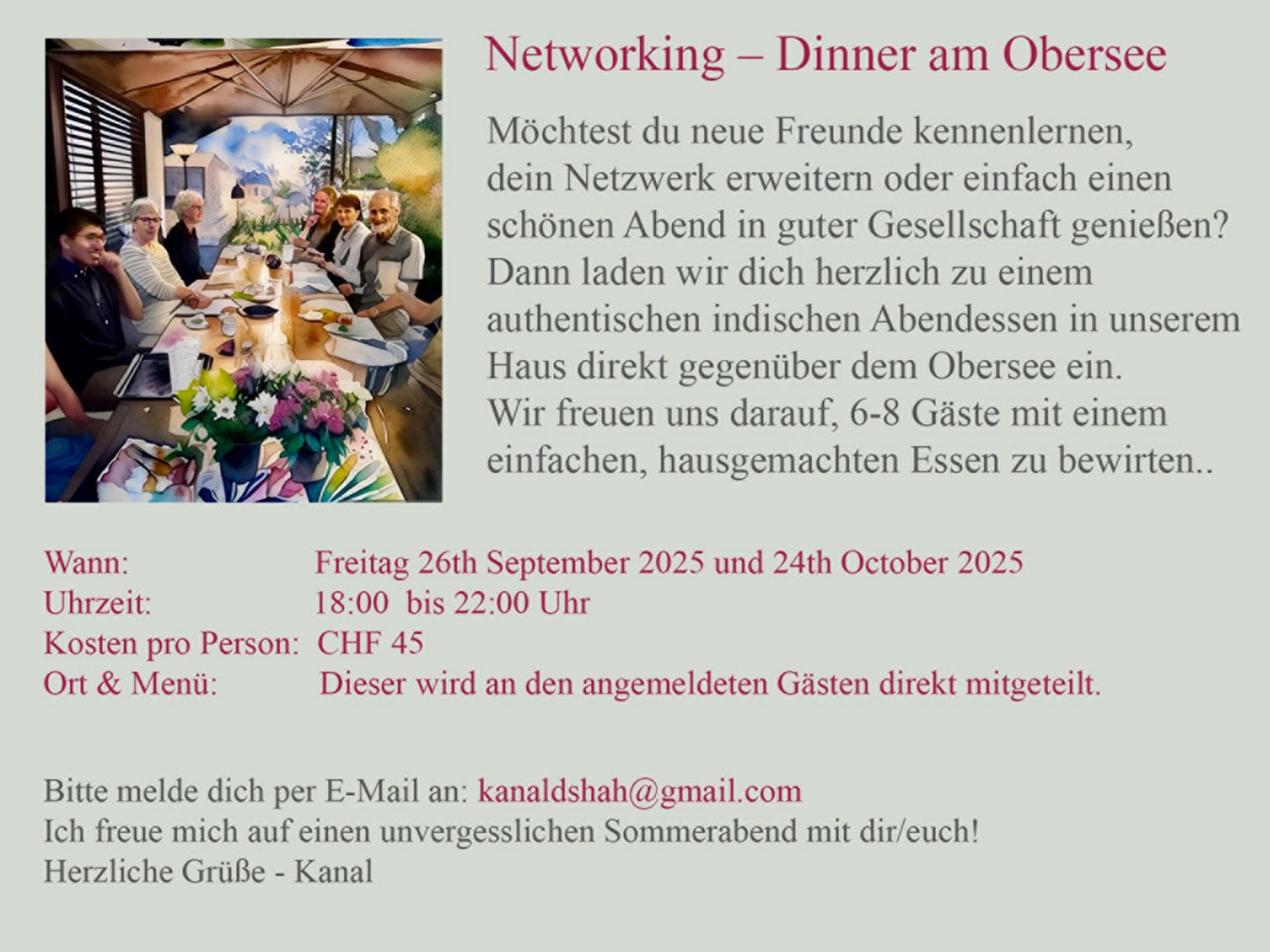 Möchtest du neue Freunde kennenlernen, dein Netzwerk erweitern oder einfach einen schönen Abend in guter Gesellschaft geniessen? Dann laden wir dich herzlich zu einem authentischen indischen Abendessen in unserem Haus direkt gegenüber dem Obersee ein. Wir freuen uns darauf, 6-8 Gäste mit einem einfachen, hausgemachten Essen zu bewirten.