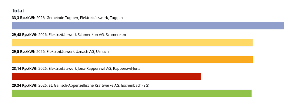 Tuggen ist der einzige Nachbar mit teurerem Strom. In Rapperswil-Jona spart man pro kWh 6.34 Rappen, was auf das ganze Jahr CHF 285.30 ergibt.