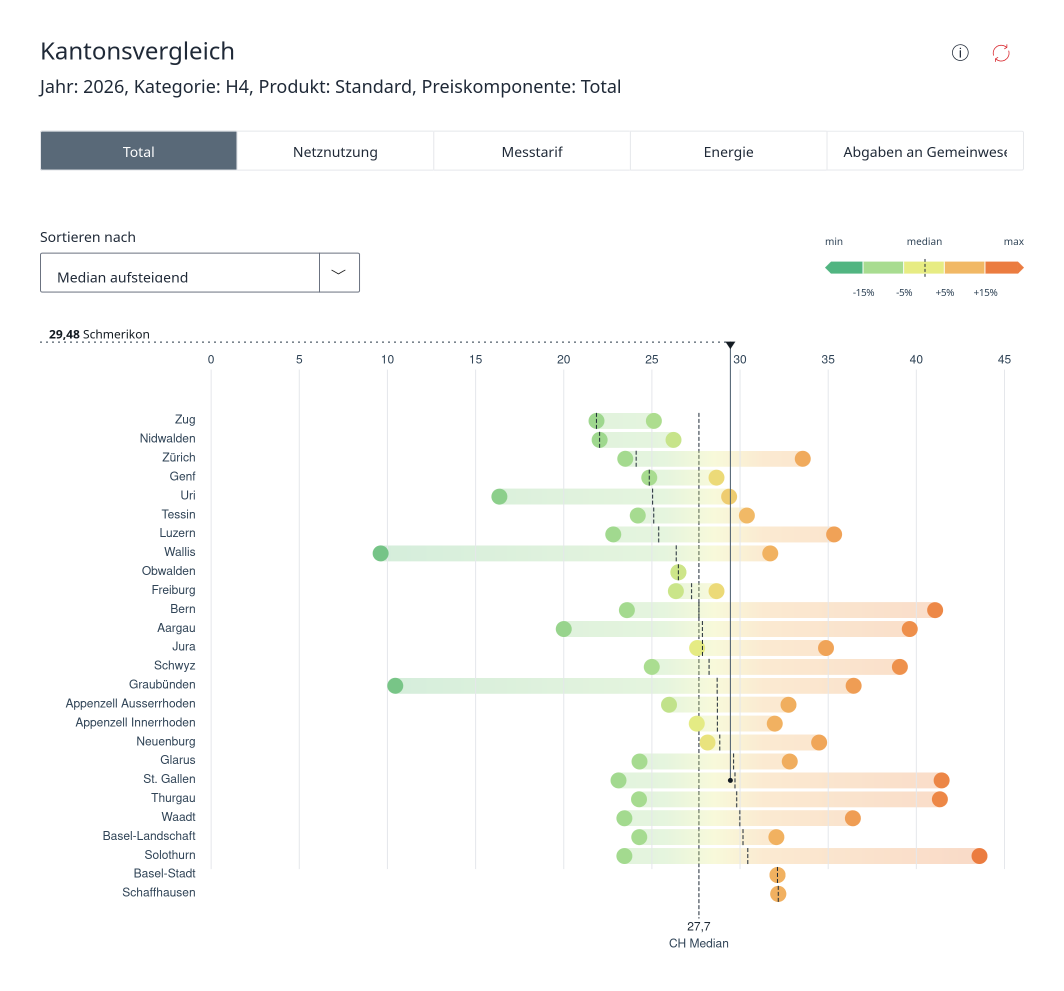 Im 2026 fällt Schmerikon innerhalb vom Kanton St. Gallen knapp unter den Median. Im 2025 waren wir noch darüber. Rapperswil-Jona ist im Kanton St. Gallen die günstigste Gemeinde. Eggersriet ist mit 41,46 Rp./kWh das Schlusslicht.