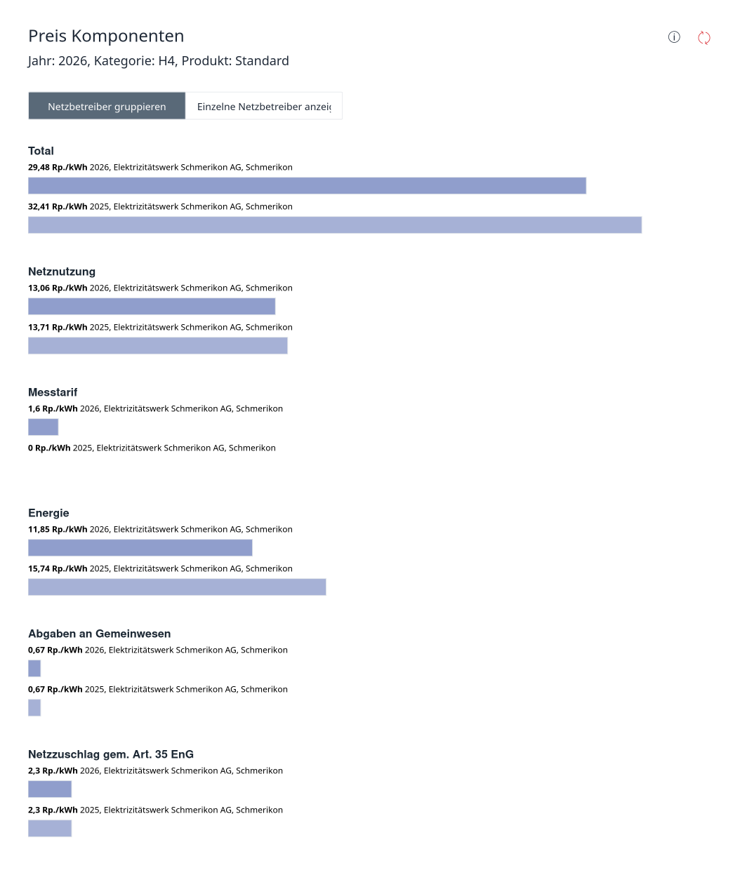 Die Strompreise fürs 2026 sind festgelegt. In Schmerikon sinken die Preise. Für einen Durchschnittshaushalt (4500kWh/Jahr) sinkt der effektiv bezahlte kWh Preis von 32,41 Rappen auf 29,48 Rappen. Für diesen Durchschnittshaushalt ergibt das eine Ersparnis von CHF 131.85 auf das ganze Jahr..