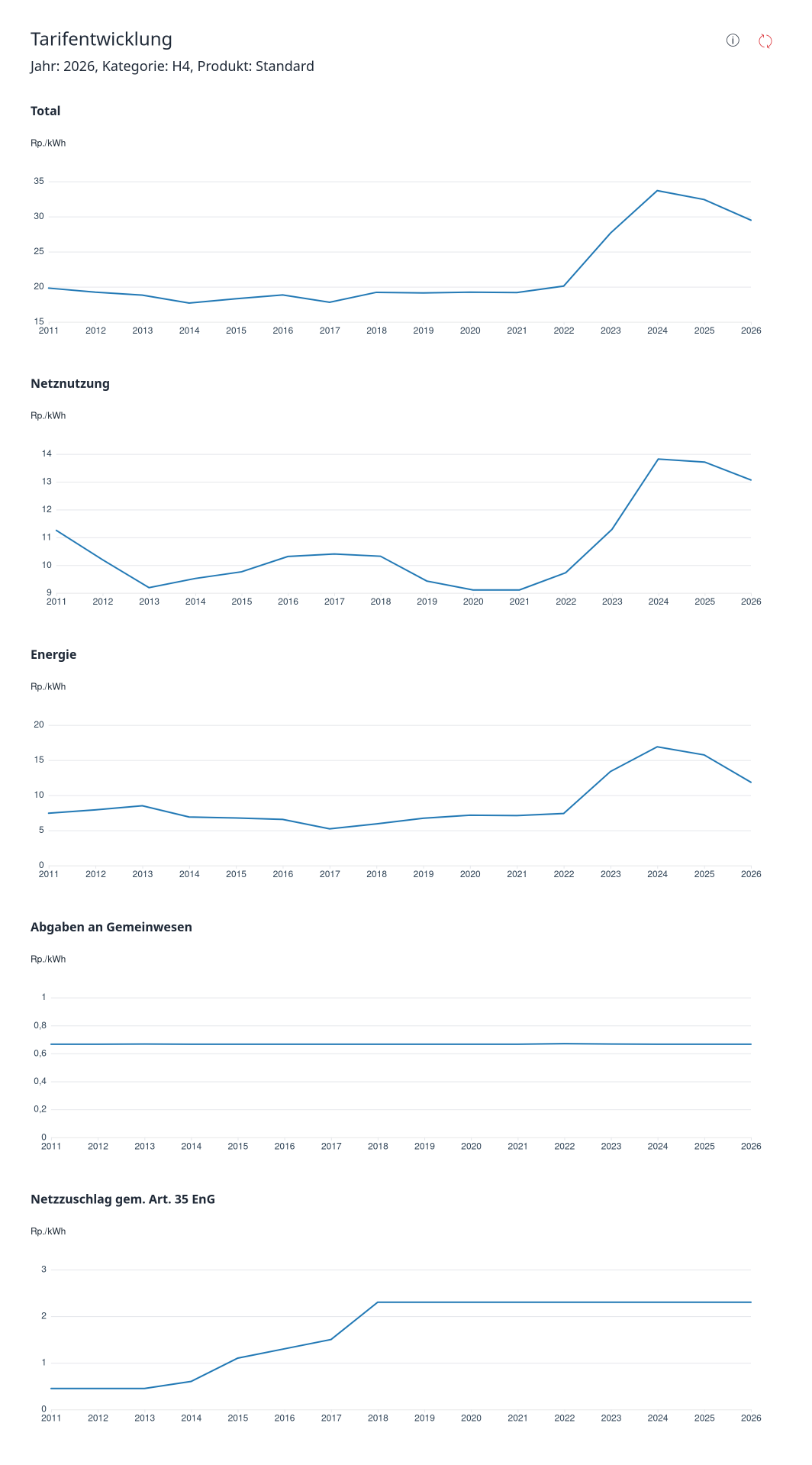 Nach einer starken Steigerung im 2023 und 2024 scheint es nun wieder leicht abwärtszugehen. Vom Niveau von unter 20.- Rp./kWh wie 2011-2021 ist der Preis aber noch weit entfernt.