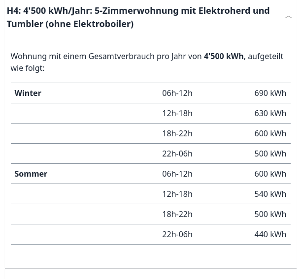 Alle Statistiken/Werte beziehen sich auf das ELCOM Szenario H4: 4500 kWh/Jahr, 5-Zimmerwohnung, mit Elektroherd (ohne Elektroboiler).