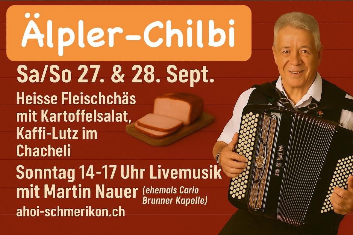 Samstag und Sonntag, gibt’s auf der «Ahoi-Alp» Livemusik, Älpler-Chacheli und frischen Fleischkäse mit Kartoffelsalat. Am Sonntag spielt Akkordeon-Legende Martin Nauer von 14 bis 17 Uhr auf. Der legendäre Musiker prägte zusammen mit Carlo Brunner und seiner Kapelle jahrzehntelang die Schweizer Volksmusik. Zum 7. Geburtstag gibt es auch einen Gratis-Wettbewerb. Bei jedem Ahoibesuch erhält man ein Gratislos und kann so eine Woche Badeferien in Spanien gewinnen. Eine Woche für zwei Personen inklusive Halbpension. Am Montag, 6. Oktober, um 20 Uhr ist die Ziehung. Für den Hauptpreis muss man nicht anwesend sein, die 10 Sofortpreise werden unter allen Gästen, die an der Ziehung dabei sind, verlost.