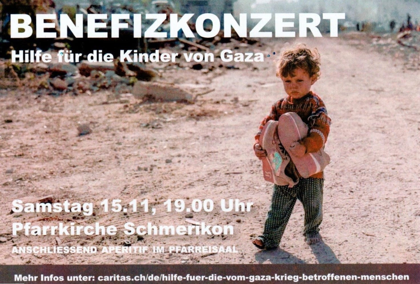 Am Samstag, den 15. November 2025 um 19.00 Uhr findet in der Pfarrkirche Schmerikon ein Benefizkonzert, zugunsten der Kinder in Gaza, statt. Initiiert wurde das Konzert von der Missione Cattolica Italiana Rapperswil-Freienbach.