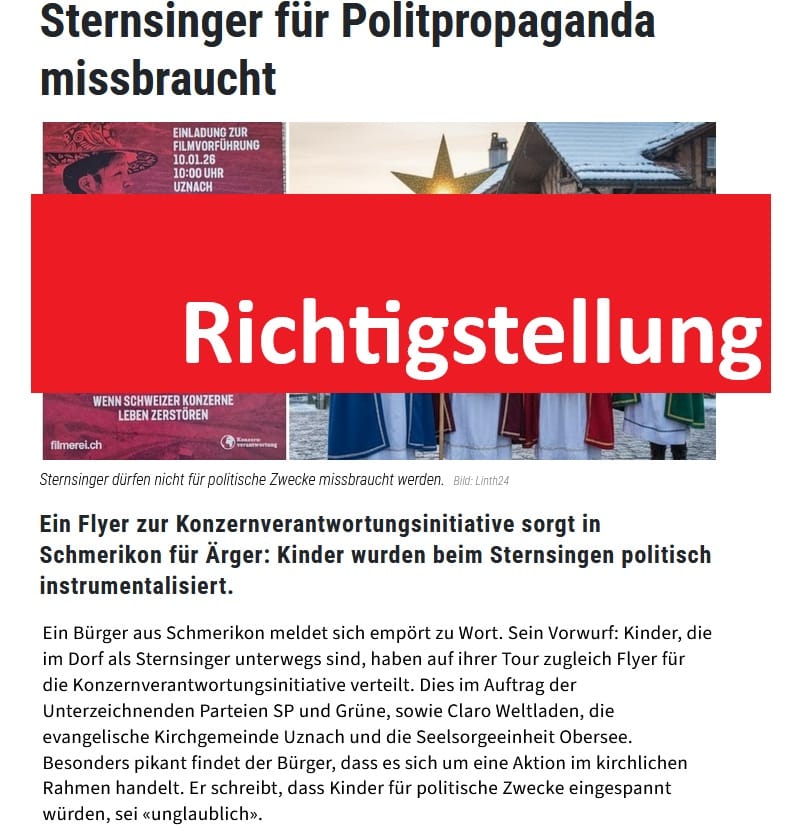 Das Seelsorgeteam der Seelsorgeeinheit Obersee und der Kirchenveraltungsrat weisen die in Linth24 gemachten Vorwürfe im Artikel «Sternsinger für Politpropaganda missbraucht. Flyer zur Konzernverantwortungsinitiative sorgt in Schmerikon für Ärger» vom 5. Januar 2026 entschieden zurück. Die Sternsinger haben nur Flyer zur Sternsingeraktion verteilt. Es entspricht nicht der Wahrheit, dass Kinder, die im Dorf als Sternsinger unterwegs waren, auf ihrer Tour zugleich Flyer für die Filmvorführung «Macht und Ohnmacht» verteilt haben. Eine solche Instrumentalisierung der Kinder und der Sternsingeraktion wäre tatsächlich scharf zu verurteilen. Es kam aufgrund einer nicht geplanten unglücklichen Gleichzeitigkeit zum Missverständnis. In Schmerikon und Gommiswald wurden die Flyer von privaten erwachsenen Personen verteilt, in Uznach erfolgte der Versand per Post.