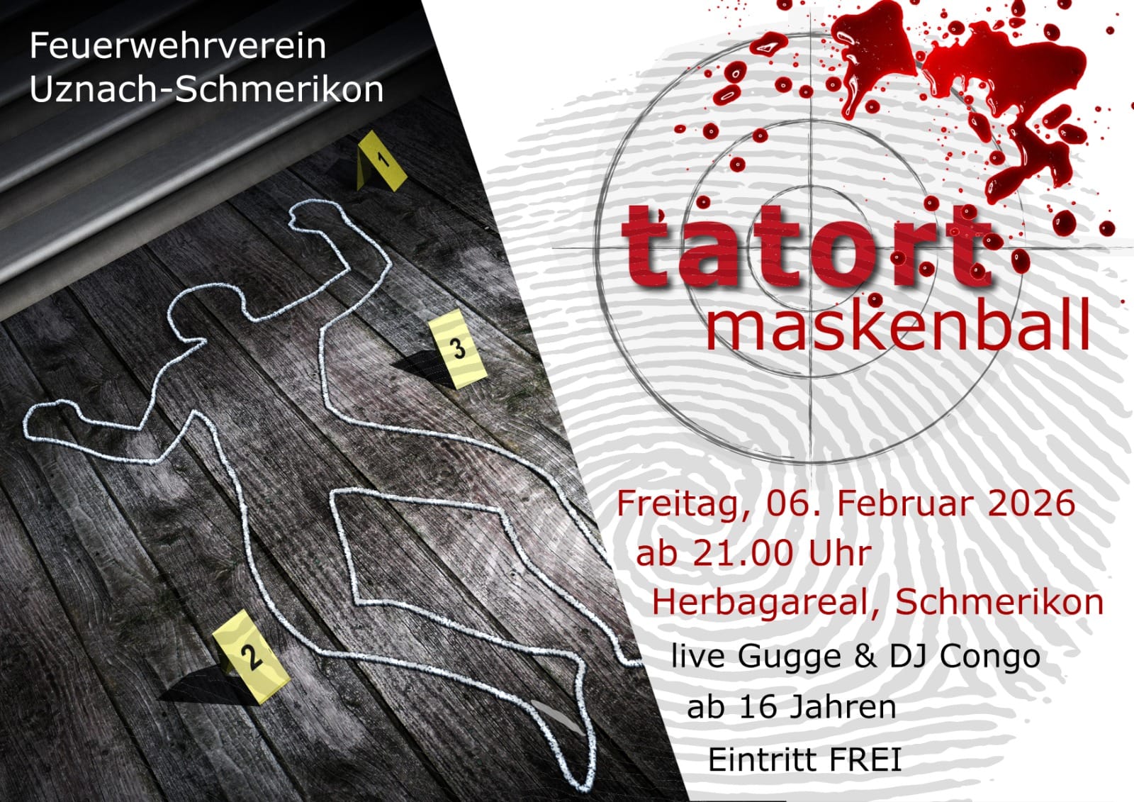 Wenn am kommenden Freitag, 6. Februar 2026 im Herbagareal die Blaulichter blitzen, ist kein Unglück geschehen, sondern der Startschuss für den traditionellen Maskenball gefallen. Der Feuerwehrverein Uznach-Schmerikon lädt ein. Dieses Jahr unter dem nervenaufreibenden Motto „Tatort“.