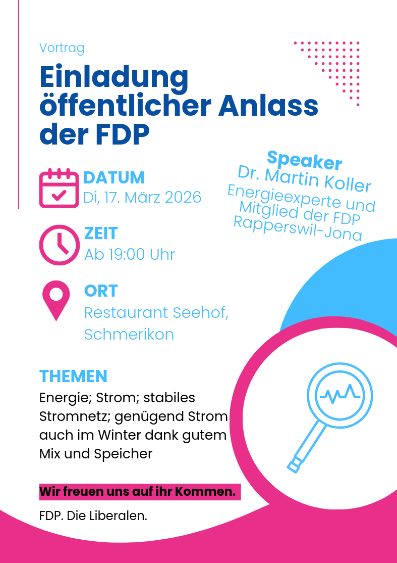 Am Dienstag, 17. März 2026, referiert der Energieexperte Dr. Martin Koller im Restaurant Seehof in Schmerikon. Der Experte, der auch Mitglied der FDP Rapperswil-Jona ist, wird aufzeigen, wie eine sichere Stromversorgung durch einen guten Energiemix und ausreichende Speicher gewährleistet werden kann.