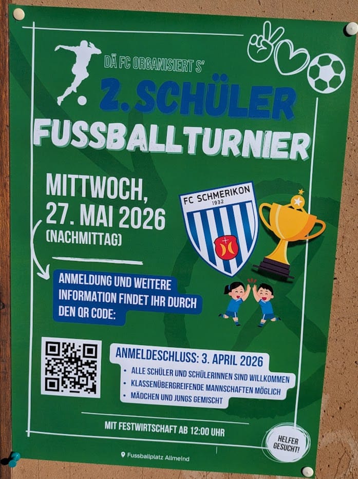 Auf dem Fussballplatz Allmeind steht Ende Mai wieder der lokale Fussballnachwuchs im Rampenlicht. Der FC Schmerikon lädt alle fussballbegeisterten Schülerinnen und Schüler zum gemeinsamen Turnier ein. Dabei stehen Spass und Fairplay im Vordergrund: Die Teams dürfen klassenübergreifend gebildet werden, und gemischte Mannschaften aus Mädchen und Jungen sind ausdrücklich erwünscht.