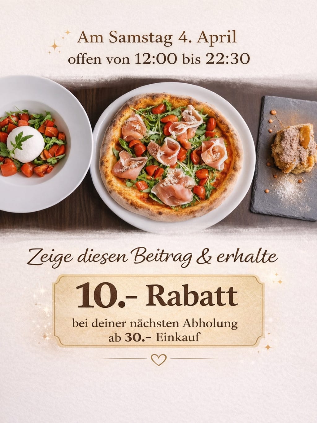 Am 4. April 2026 sind wir von 12:00 – 22:30 für euch da 🍕