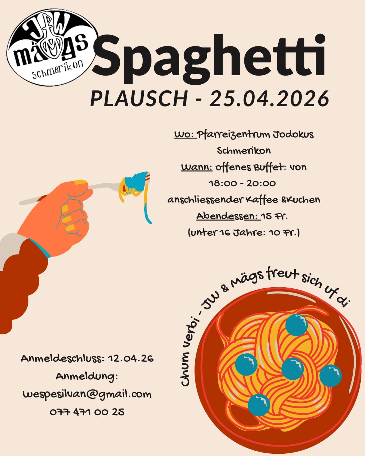 Hast du Lust auf feine Pasta, Kuchen und gemütliches Zusammensein? Dann komm am 25. April 2026 ins Jodokus vorbei. Willkommen, sind alle, von jung bis alt. Das Buffet ist von 18.00 bis 20.00 geöffnet, im Anschluss klingen wird den Abend mit Kaffee und Kuchen aus.