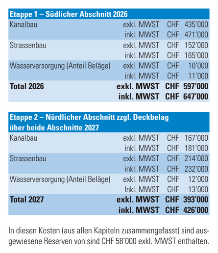 - Strassenbau: 400'000 Franken (inkl. MWST) für die Erneuerung des Strassenoberbaus.